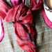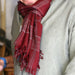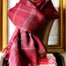 Fine merino wool scarves handwoven by artisans in West Bengal using traditional handloom and weaving techniques. These are a rich burgundy red with large check design in grey and an unfinished hem.