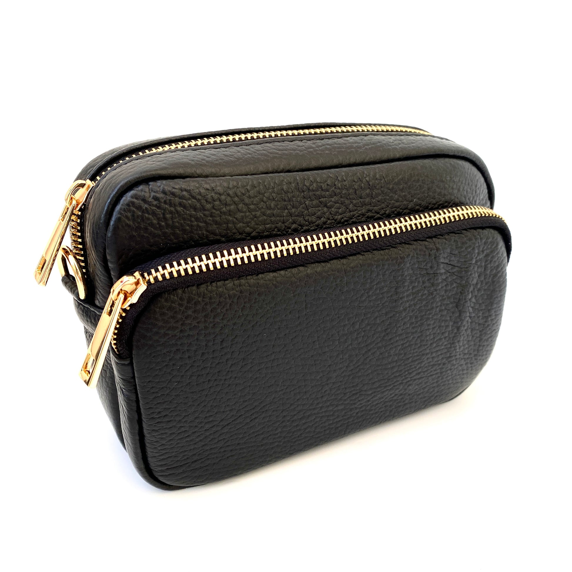 The gorgeous double zip leather camera bag is a very smart and practical small bag with two zip compartments so that you can keep your phone or cards easily to hand in the front zip up compartment and your other handbag essentials in the main zip up compartment. This fabulous bag comes with a matching leather narrow strap, which is also adjustable. It clips on to the loops at the side of the bag, or alternatively leave the strap off to have a beautiful clutch bag. The hardware on this bag is gold. The bag measures approximately 18.5 cm wide x 16cm high x 7cm deep. The Pink Pheasant stocks 14 colours of this bag. To see other options please visit www.thepinkpheasant.co.uk .