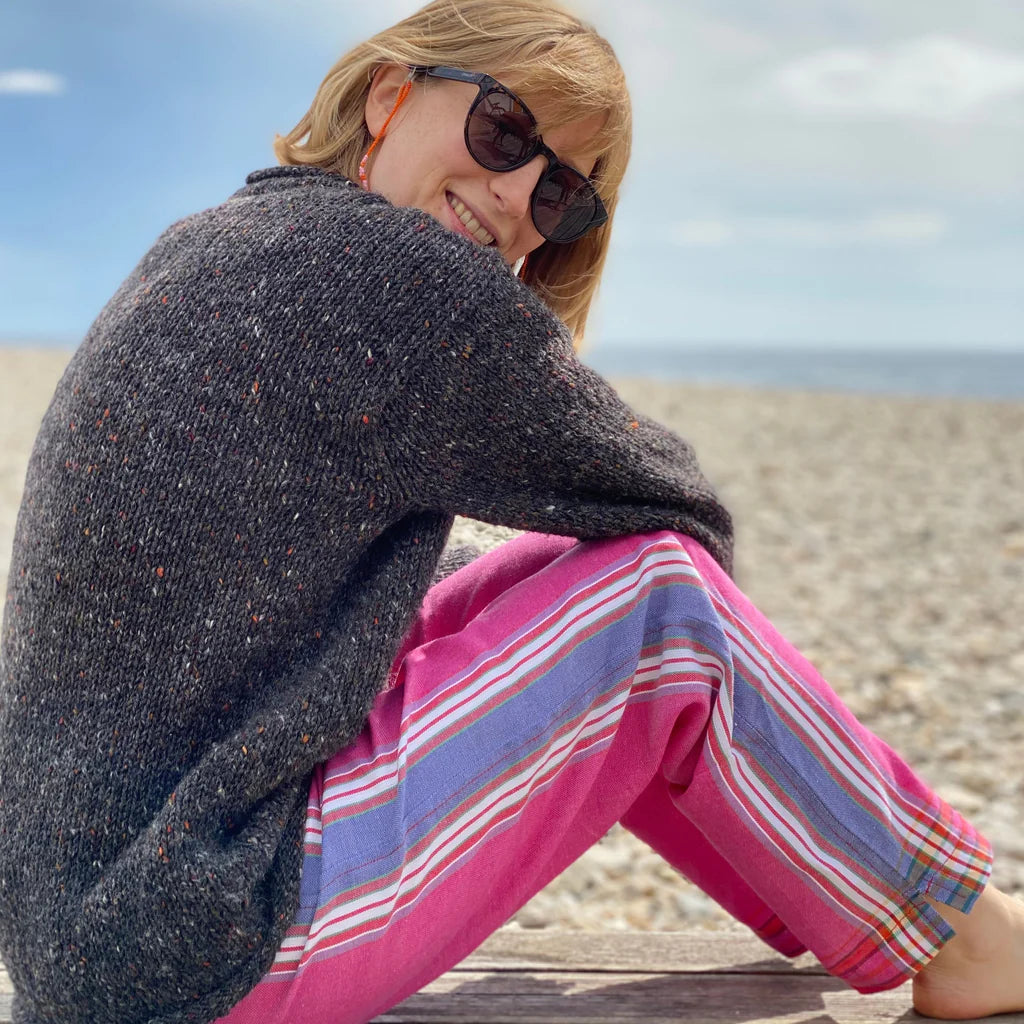 In the beginning, these kikoy pull-ons were our DNA....the only things we made, to kick start our fundraising efforts to build that very first classroom! TheyÕve stood the test of time, and our colours get better and better. Iconic, popular, in bright, happy colour fabrics in plain hues with a broad contrasting stripe down the side, and all imbued with sunshine! Easy to wear and long in comfort! Generously cut. Short colour runs to reduce waste.