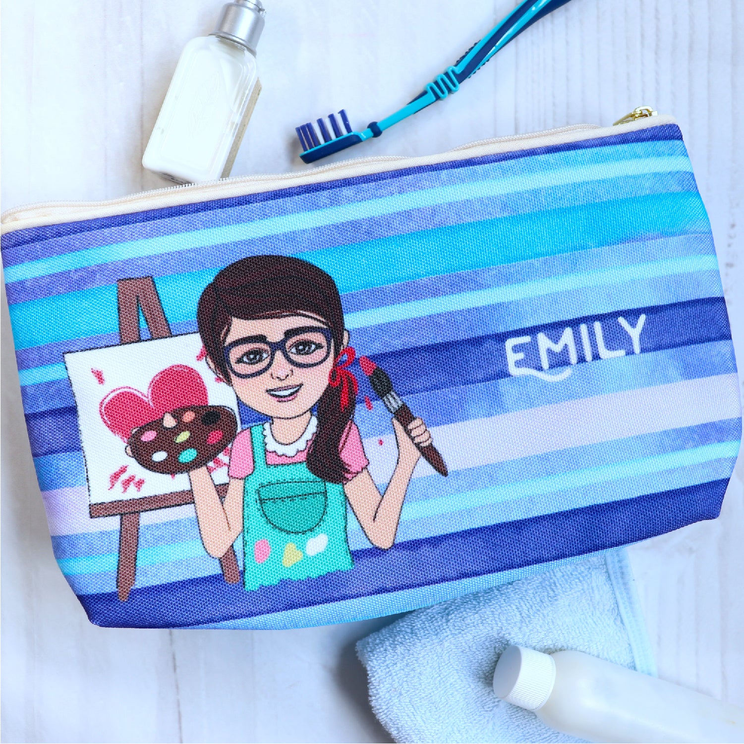 Our high-quality washbags with a waterproof lining are personalised with a customised character of that special girl and a name or phrase. They are great for easily organising your little one's toiletries, personal care items and essentials for trips, days out or sleepovers.