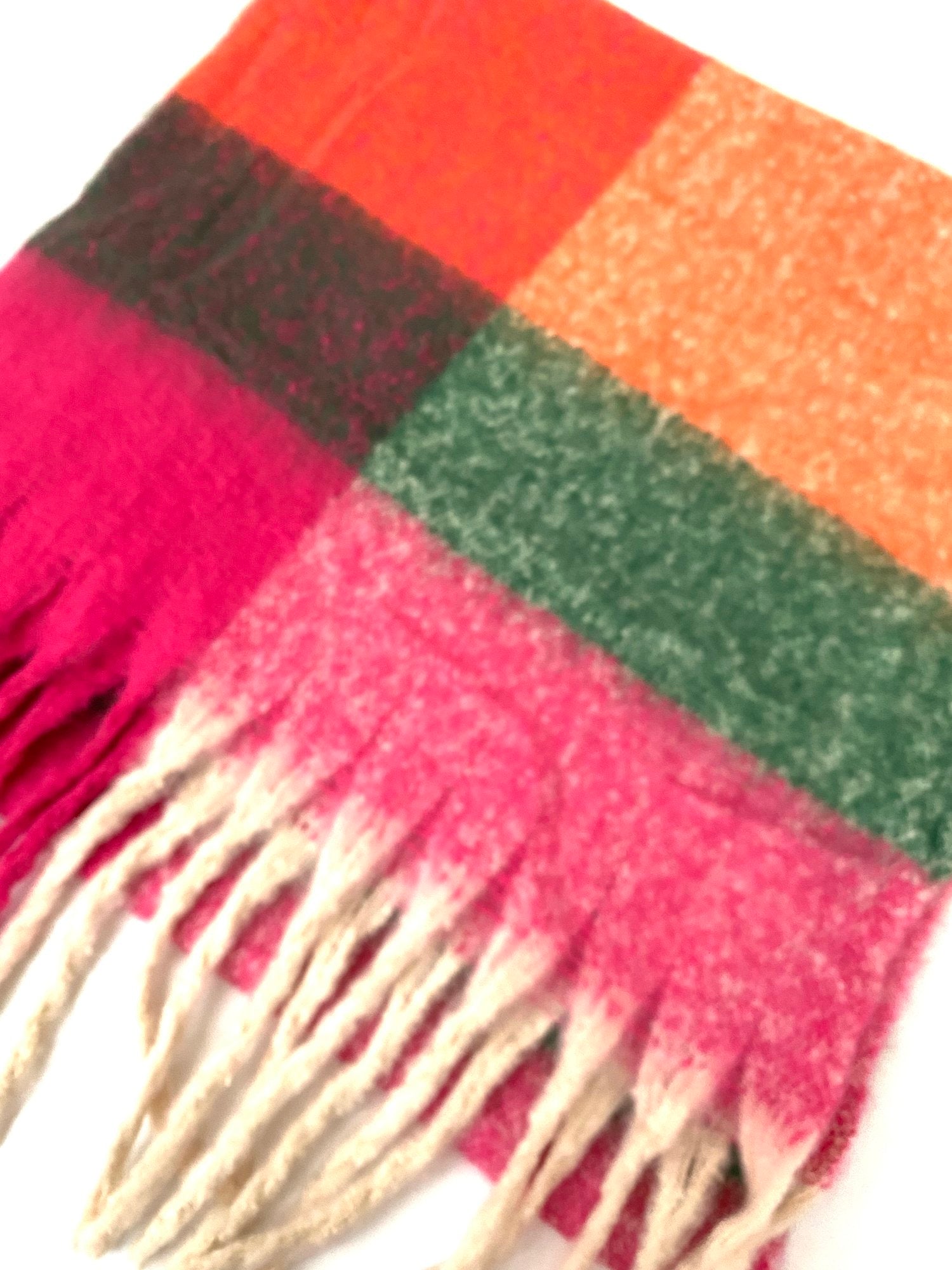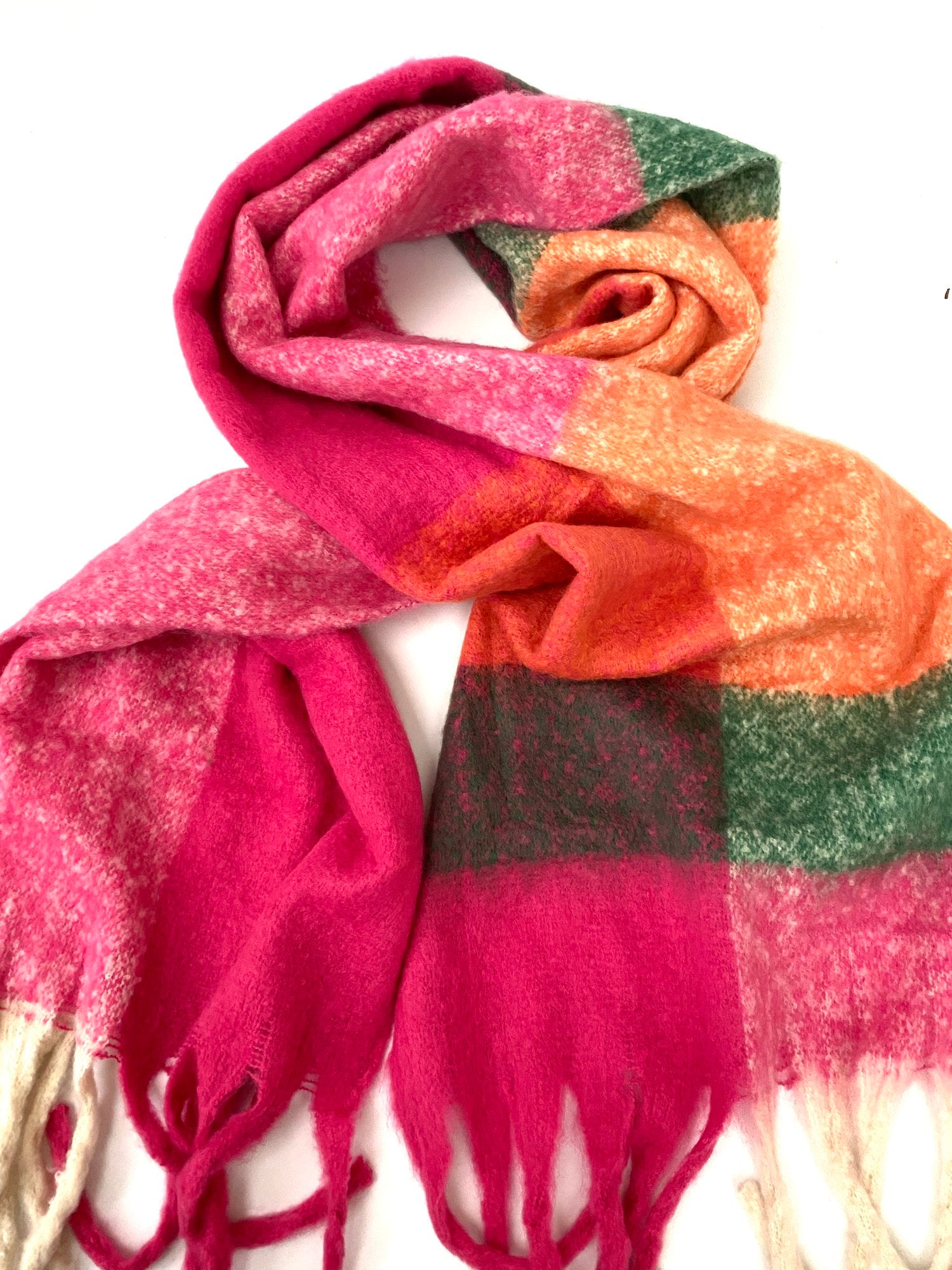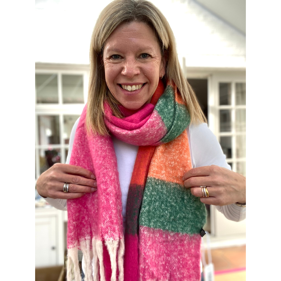 A fabulous oversized winter scarf crafted from soft to the touch viscose. Showcasing a vibrant hot pink and green square colour block design and a bohemian influenced tasselled fringe. Perfect for winter weather and a fabulous pop of colour.