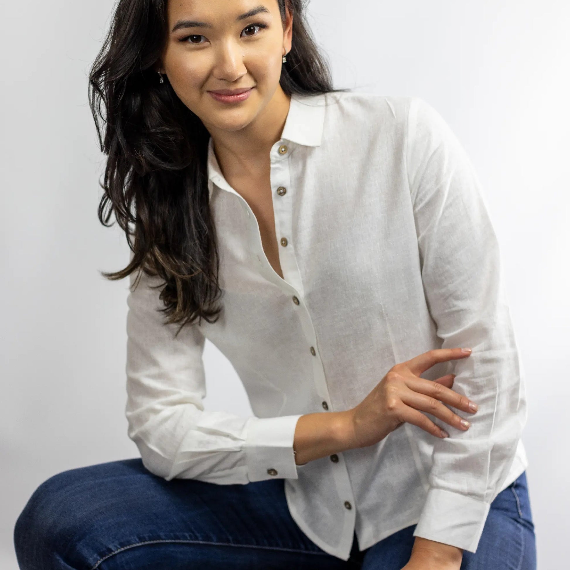Women's white shirt in sustainable 40% hemp/60% Loycell with coconut buttons.